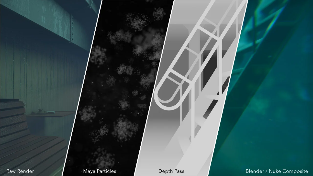 The same scene rendered under different lighting conditions at different times of day. Lighting, animation, and particle effects in Maya. Material shaders developed and rendered using RedShift 3D GPU rendering. Composited in Blender and Nuke.